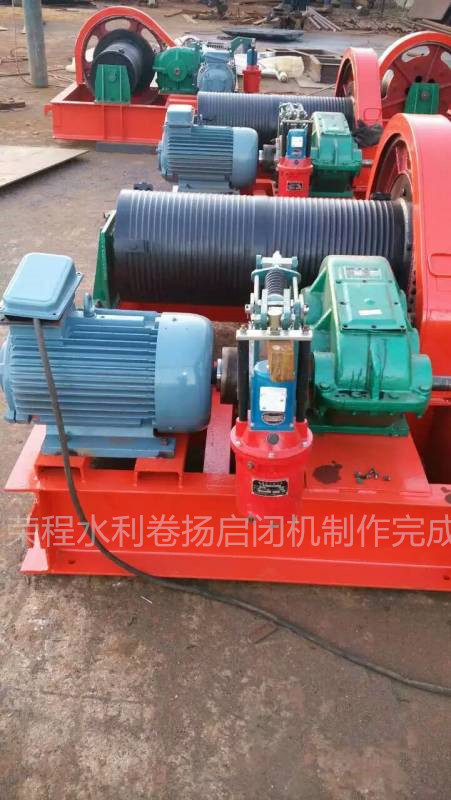 卷揚啟閉機又名絞車,有主滾筒總成、絞車架及護罩總成、角傳動箱總成、轉盤傳動裝置、主滾筒剎車系統、主剎車冷卻循環系統、水剎車、水剎車水循環系統、絞車動力輸入輸出護罩、天車防碰裝置等所組成。鉆修機絞車部件設置在動力絞車撬座上,結構緊湊、安裝、拆卸方便。