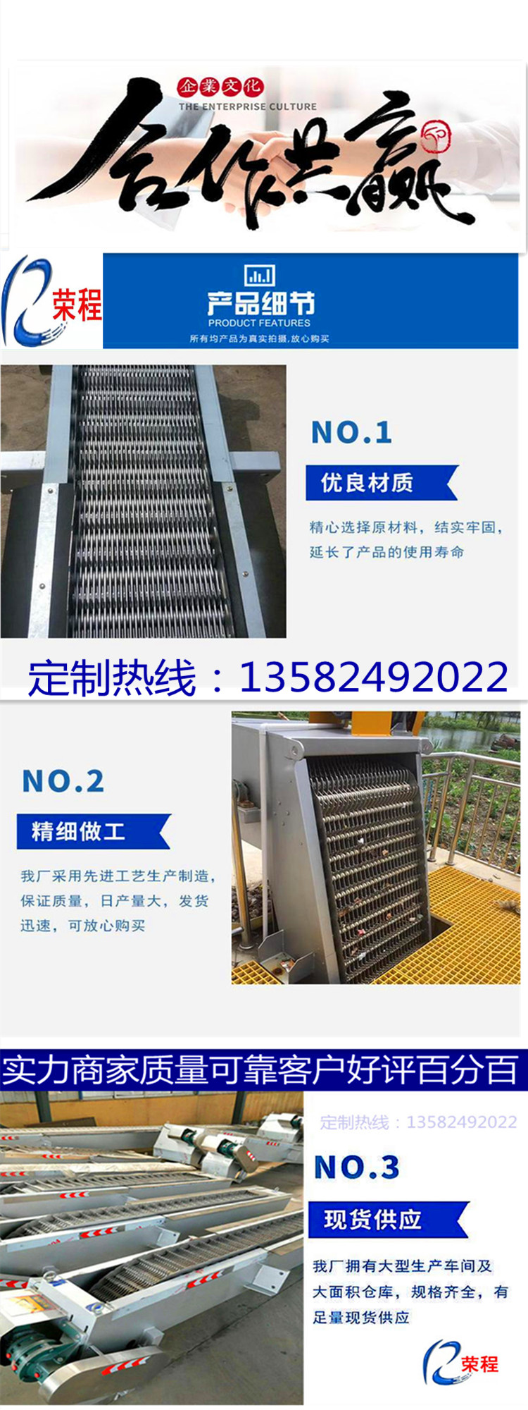 1.齒耙柵條后下行,柵條前上行撈渣,不會(huì)將柵渣帶入水下,撈渣徹底。